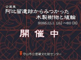 11月1日㈯より、企画展示「阿比留遺跡からみつかった木製樹物と埴輪」を開催しています!昨年実施しました阿比留遺跡第6次調査で出土しました木製樹物と形象埴輪の展示を11月1日㈯から30日㈰まで開催しております。木製樹物とは、埴輪のように古墳に立ち並べられたもので、そのうちの石見型木製品は国内18例目、盾形木製品は4例目と、大変珍しい出土品です。是非、ご覧ください。ご来館をお待ちしております。